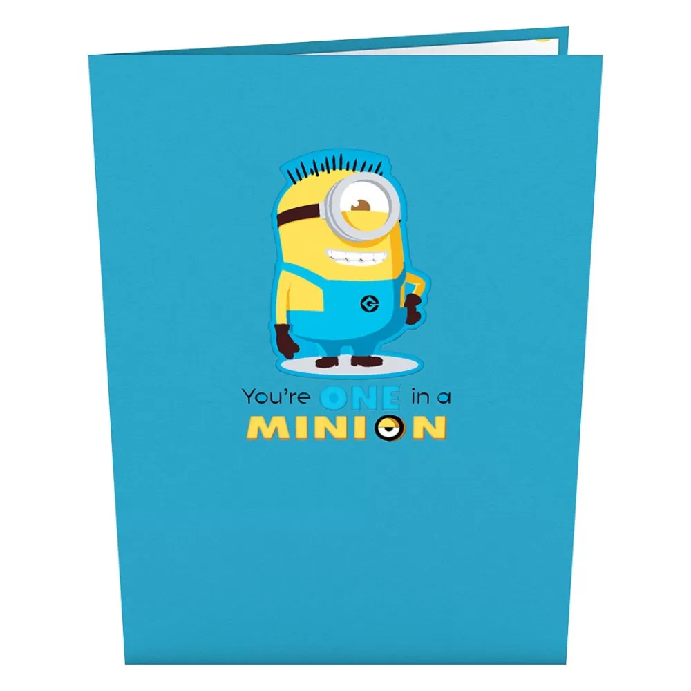 The You’re One in a Minion pop-up card is 5 inches wide by 7 inches tall.