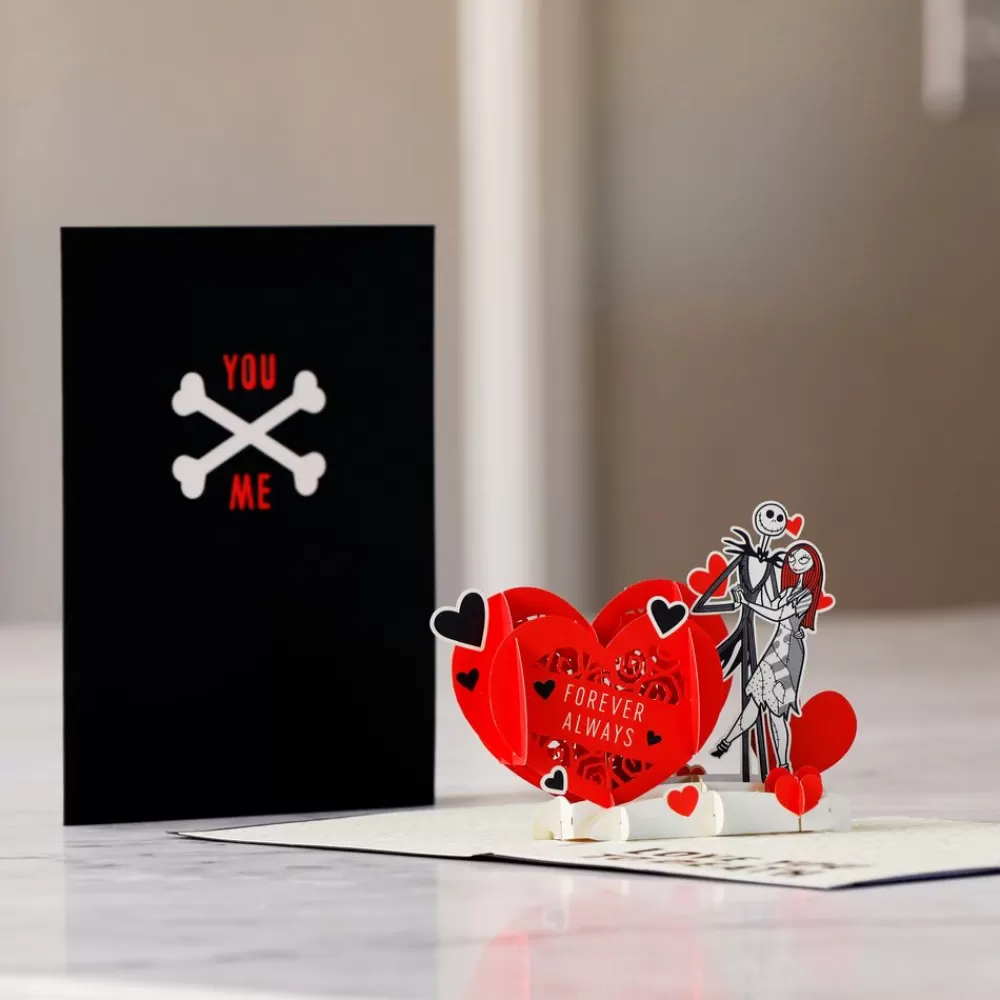 The Disney Tim Burton’s The Nightmare Before Christmas Love You to Death pop-up card is 5 inches wide by 7 inches tall.