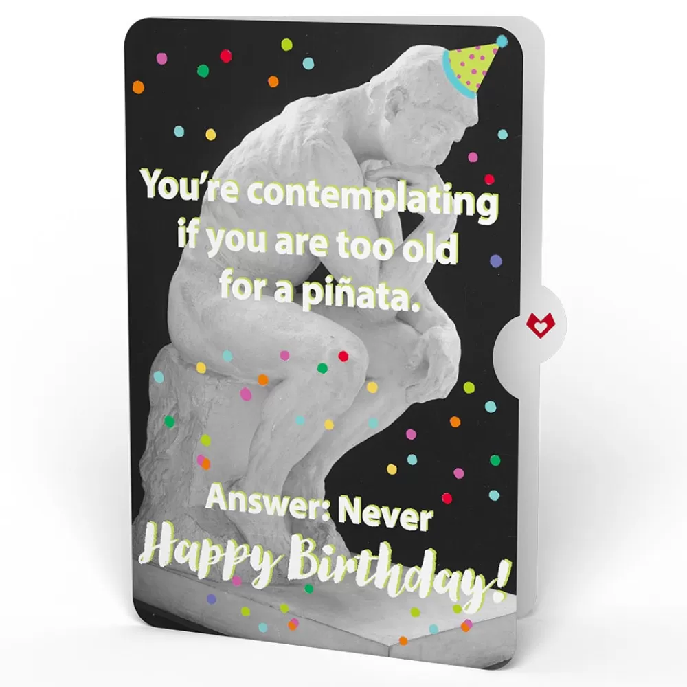 - Special Sentiment: The companion sentiment card brings humor and light-heartedness with a playful image of “The Thinker” statue contemplating the age-old question, accompanied by the message: “You’re contemplating if you are too old for a pinata. Answer: Never. Happy Birthday!” – perfect for a laugh and a reminder that age is just a number when it comes to having fun.