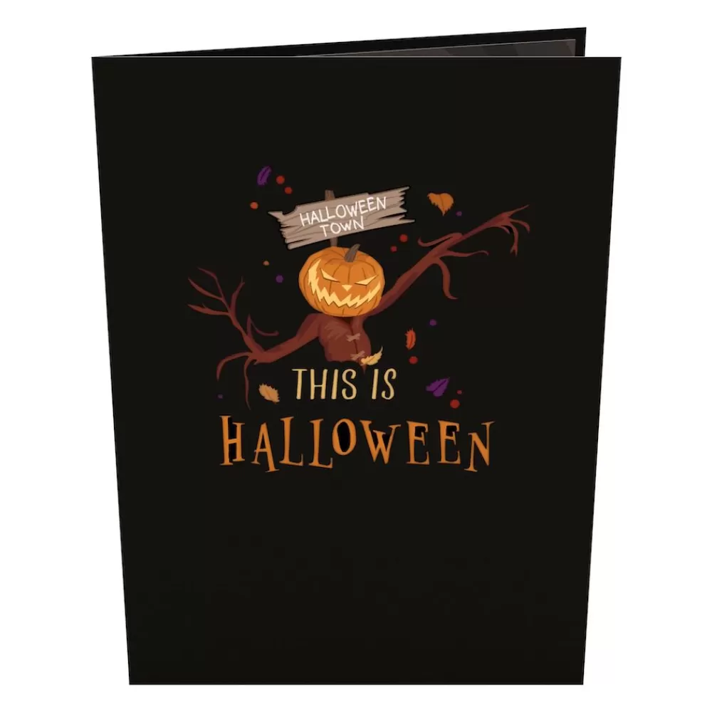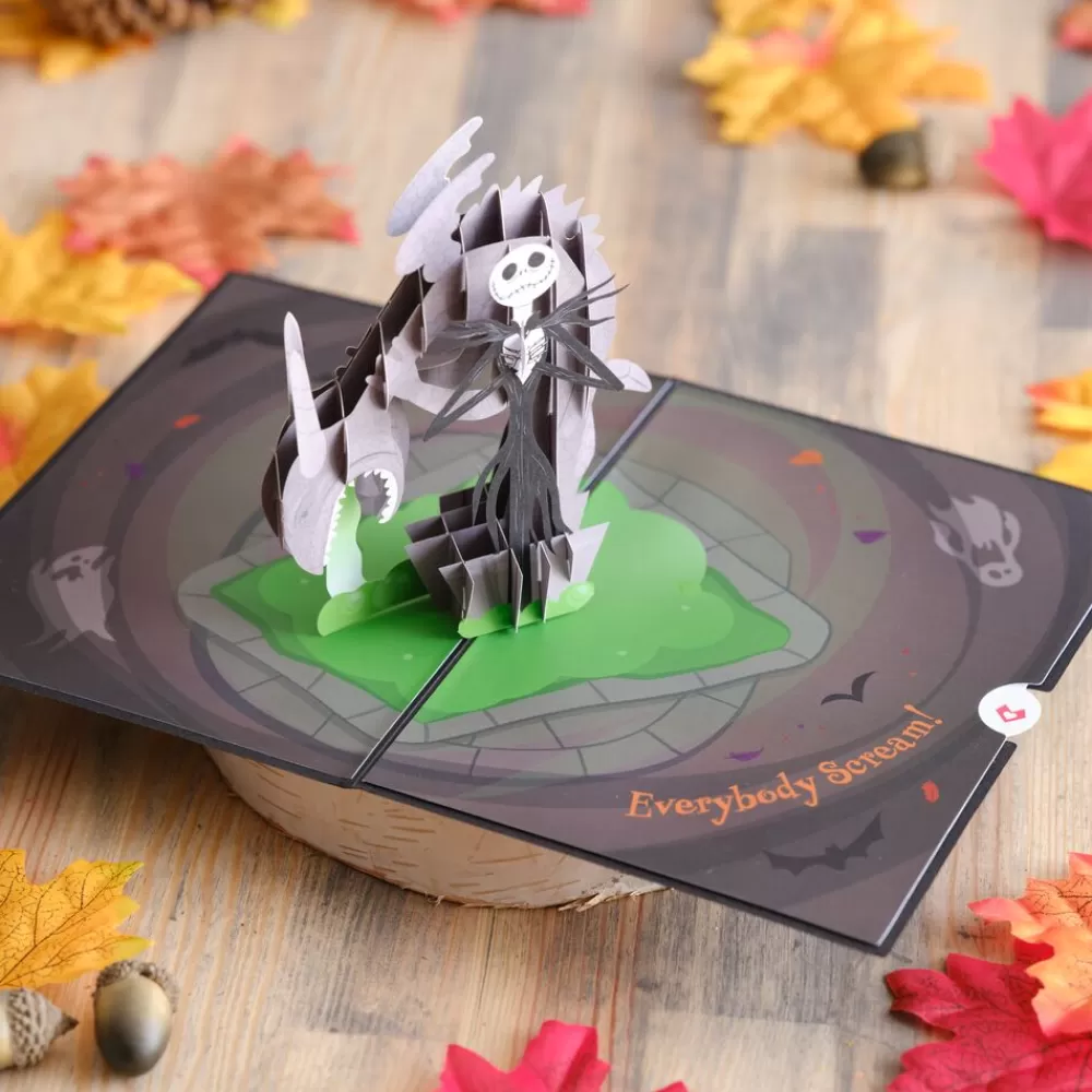 This pop-up card features a 3D depiction of Jack Skellington next to the fountain with glowing green waters. The black cover has an image of The Pumpking King and a “Halloween Town” sign colored in oranges, purples, and browns. The message “This Is Halloween” sits below the character. On the inner panels of this card design, “Everybody Scream!” is written.