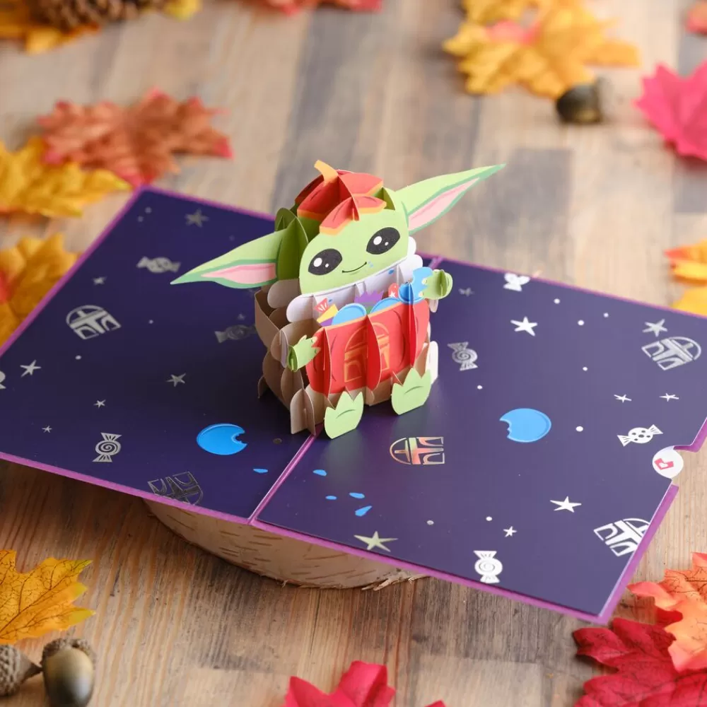 The Mandalorian Grogu No Tricks All Treats pop-up card is 5 inches wide by 7 inches tall.