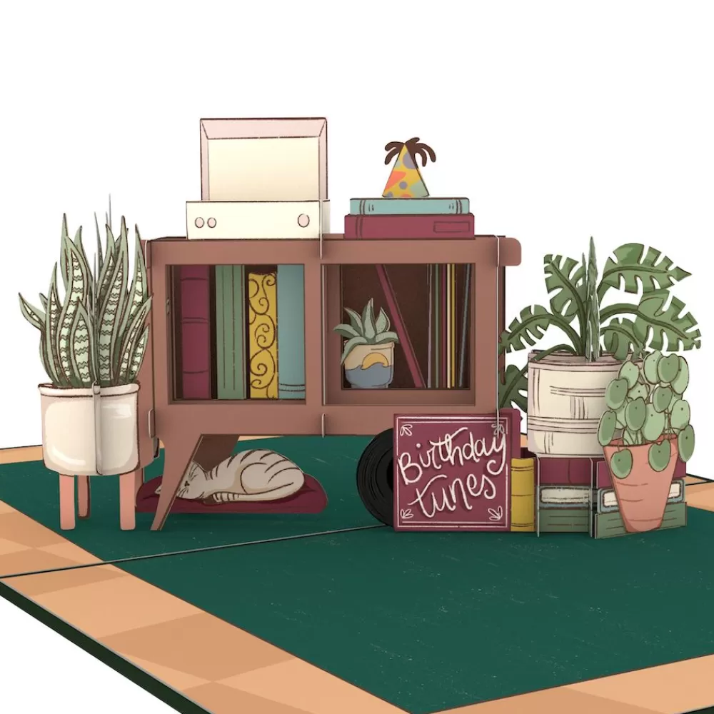 - Mini Greenhouse Design: The main card opens to reveal a detailed 3D pop-up of a cozy mini greenhouse filled with potted plants, shelves, and gardening tools. The cover, adorned with the warm message “Happy Birthday,” hints at the botanical surprise inside, making it a delightful treat for any plant lover.
