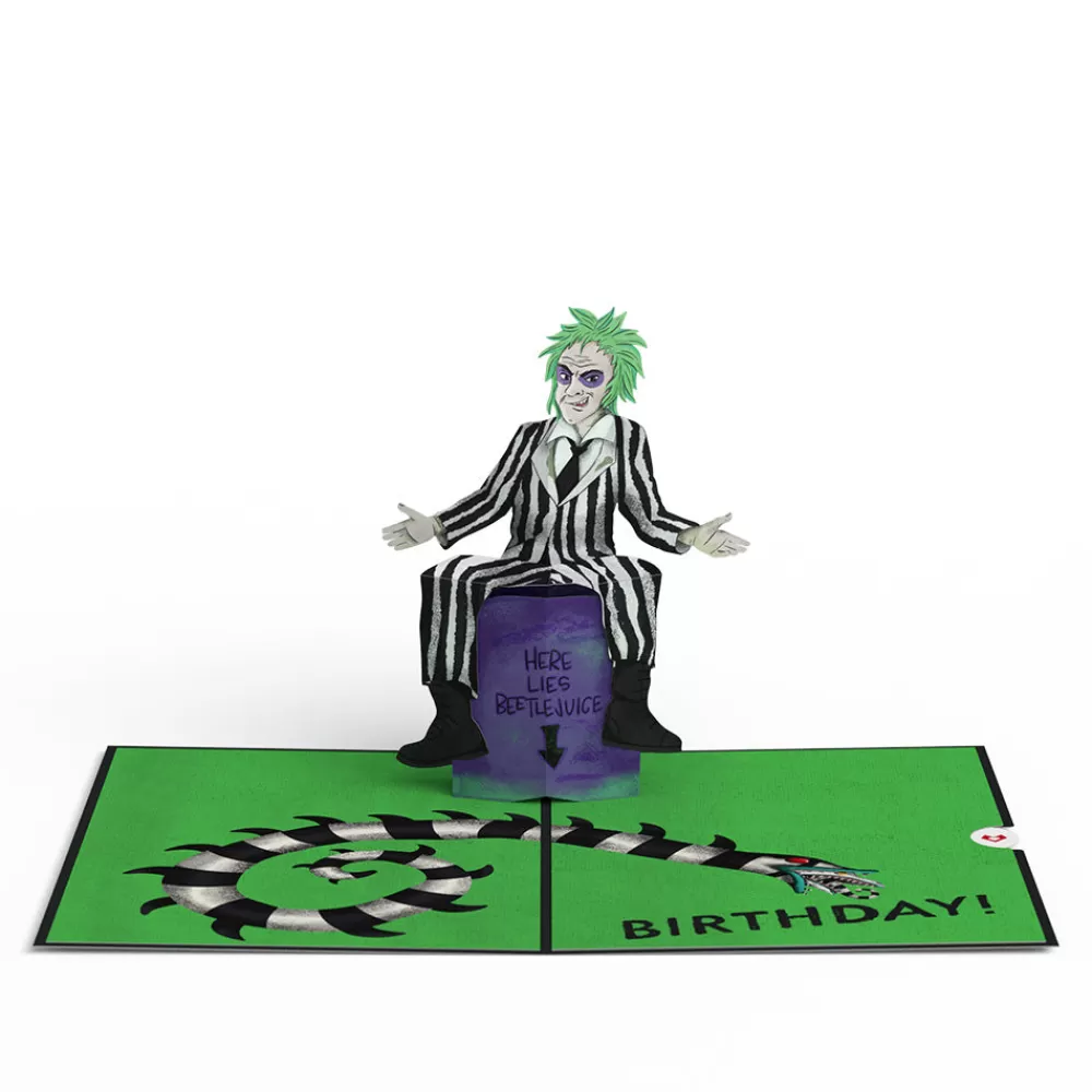 Description: Wish someone special a Happy Birthday with this hilarious Beetlejuice pop-up card. Give it to friends or family who love the cult classic movie, or those who just love dark humor and all things strange and unusual.