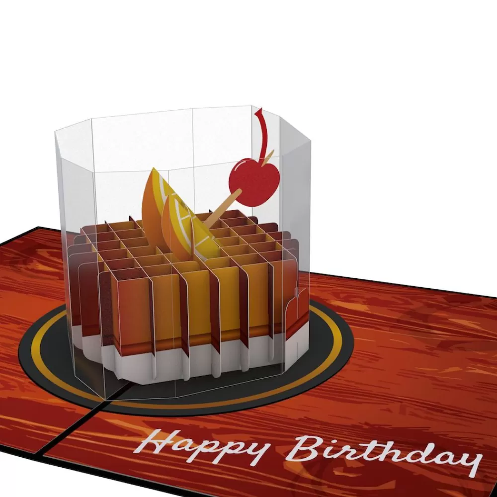 - Old Fashioned Drink Design: The main card opens to reveal a detailed 3D pop-up of a classic Old Fashioned cocktail, complete with ice, an orange twist, and a cherry garnish. The cover invites celebration with the elegant message “Celebrate! The Old Fashioned Way” making it a stylish and memorable way to mark the occasion.