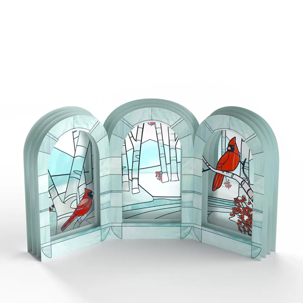 One pop-up Stained Glass Winter Cardinal Pop-Up Gift with a Lovepop Note, packaged in a love-filled sleeve.
