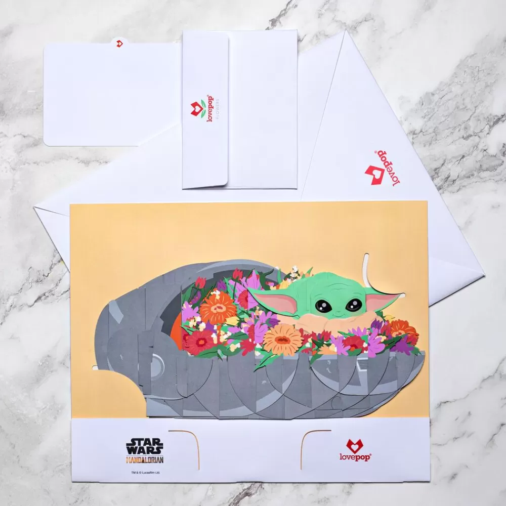 One Star Wars™ The Mandalorian™ Floral Grogu™ Giant Pop-Up Gift with a blank Lovepop Note for writing a personal message, packaged in a protective paper envelope.