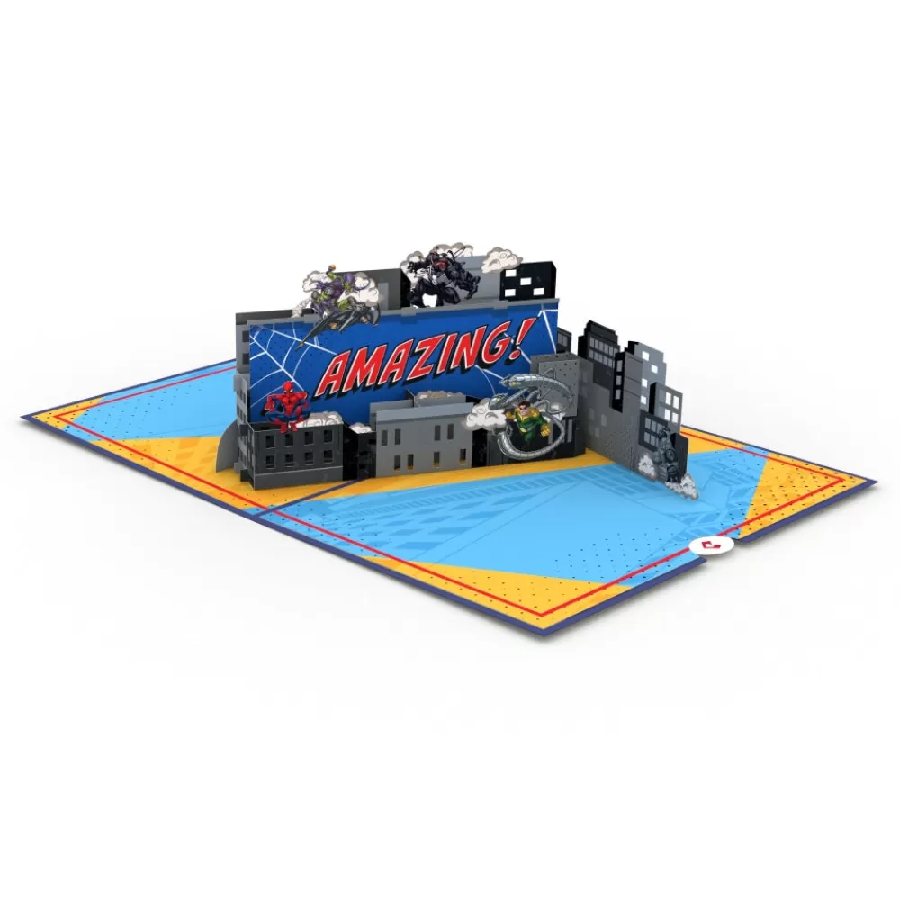The deep blue front of this Marvel pop-up card showcases Spider-Man and the words “Dad you are…” in red and yellow letters. Inside, a 3D city scene jumps to life with gray buildings, one painted blue and red with the word “AMAZING!” to finish the sentiment from the front of the card. Spider-Man battles his nemeses among the laser-cut structures, with Doc Oc, the Green Goblin, and Venom springing to action. The inside cover is bright yellow and pale blue, featuring designs of the tops of buildings, prepped for Spider-Man to swing across.