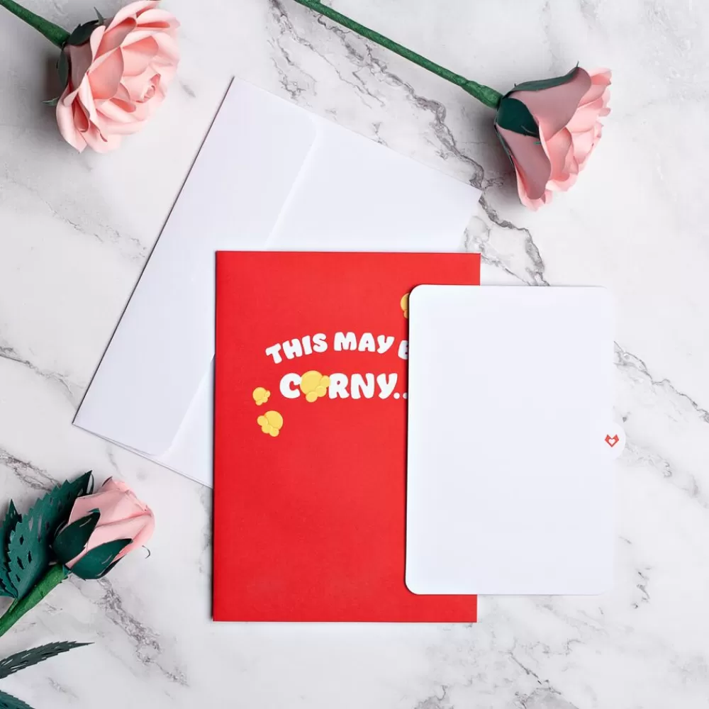 Kernels of freshly popped popcorn bounce on the bright red cover of this 3D card, inviting you to check inside for the second half of a clever phrase in white lettering. When you open the card, a pair of adorable popcorn characters hold hands and wave, with kernels of popcorn dancing across the dark gray background. The phrase continues on the inside of the card, completing a sweet salutation.
