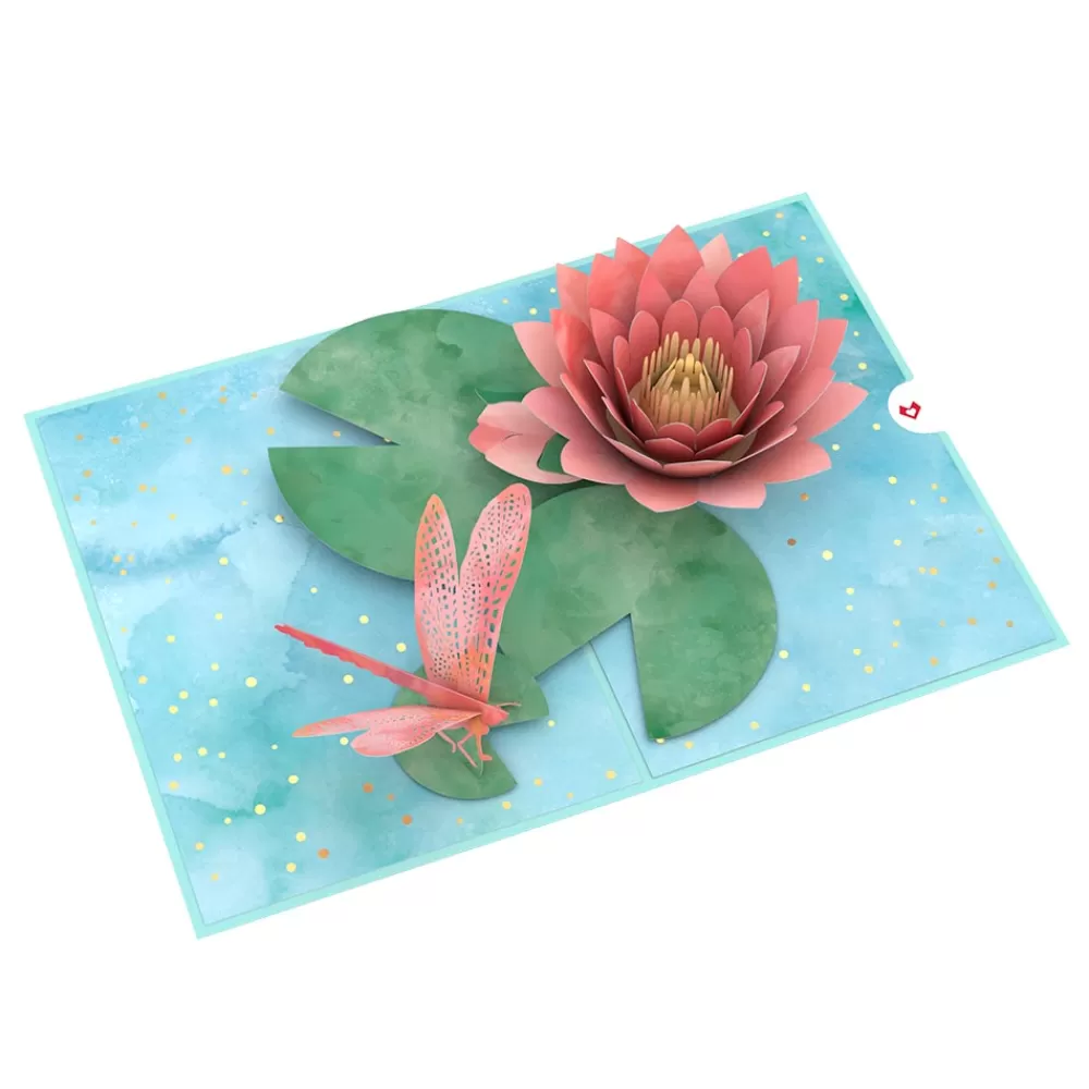 The Water Lily Dragonfly pop-up card is 5 inches wide by 7 inches tall.