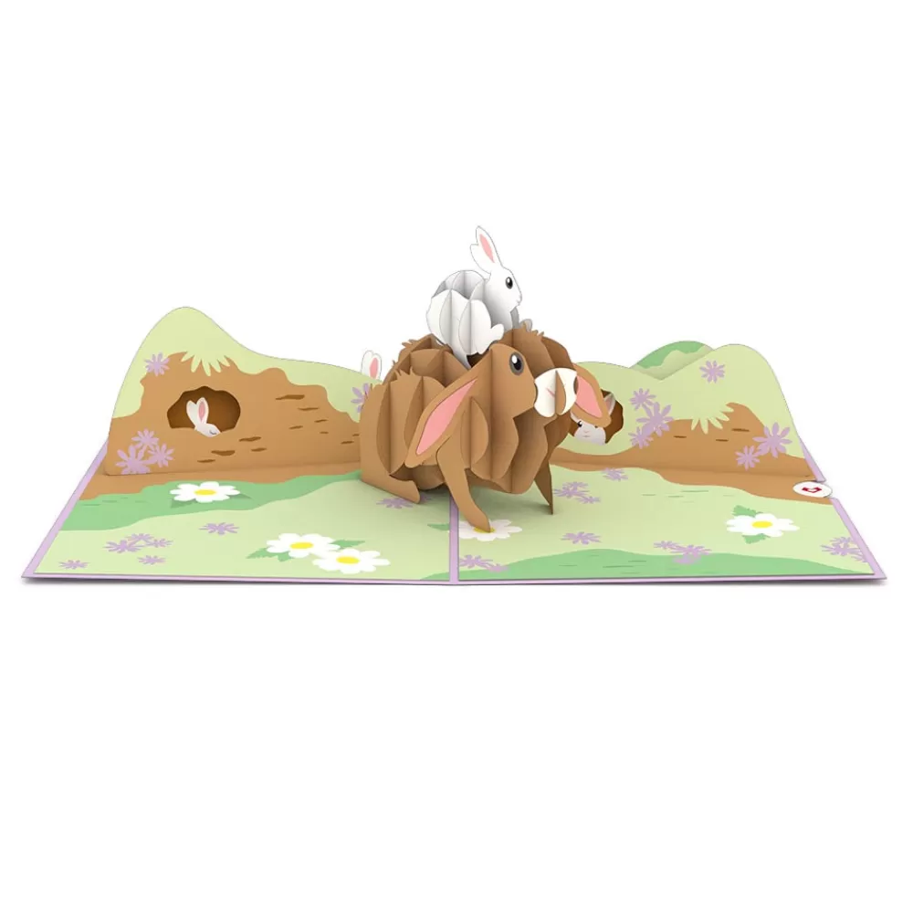 Once opened, the Bunny Family reveals the two bunnies from the cover in the center of the card. The white bunny is perked up while the bigger, brown bunny, with its ears pointed slightly downward, is standing in place on the flowery meadow. Behind the Bunny Family, a moss-and-flower-covered log is home to three more little white bunnies!