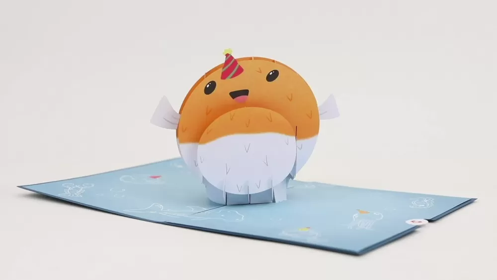 This birthday pop-out card uses a deep blue front cover with bubble designs to welcome you with an undersea theme. A smiling pufferfish holds a bunch of balloons and wears a party hat, swimming under the message ‘Have a SWELL Birthday!’ Inside the card, the pufferfish inflates with joy, popping up in 3D with its arms outstretched to offer big birthday hugs. The inside cover is light blue and showcases detailed white illustrations of bubbles and a hammerhead shark, a lobster, a jellyfish, a seahorse, and a stingray joining in the birthday festivities, with some wearing colorful party hats.