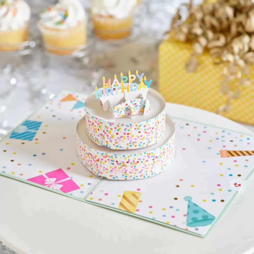 The pale green front cover of this unique birthday card shows a colorful birthday cake with pink, orange, and blue layers inside and rainbow sprinkles on the outside. A striking birthday candle erupts from the top of the cake, emitting sparks and confetti. Inside the card, the cake stands up in 3D, its sprinkles popping with brilliant color against the white icing. The top of the cake holds letter-shaped candles that spell out ‘Happy Birthday.’ On the inside cover, birthday supplies scatter among confetti, including party hats and gifts.