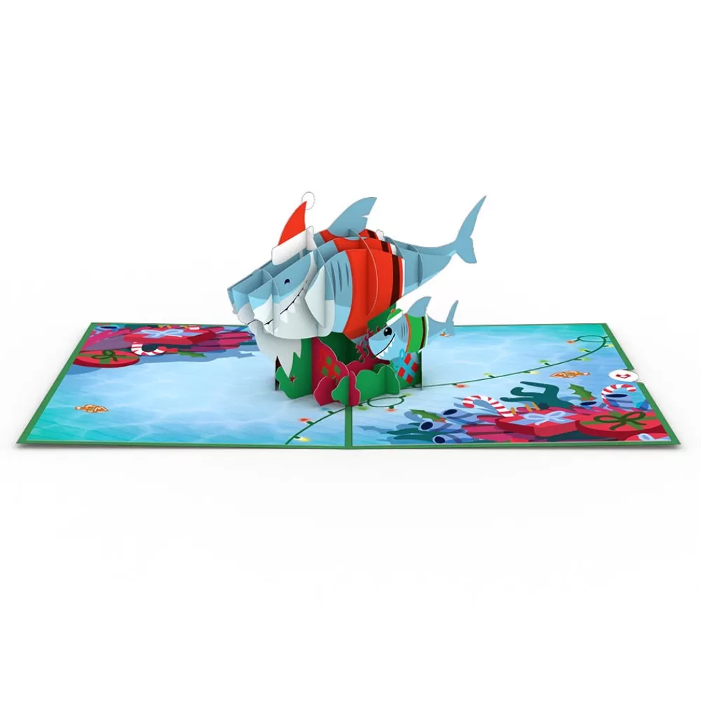 Once opened the 3D pop up design reveals Santa Shark and his sidekick Elf Shark traveling through the ocean bottom in a red and green sleigh. The base of this new design is embellished with presents, candy canes and Christmas lights.