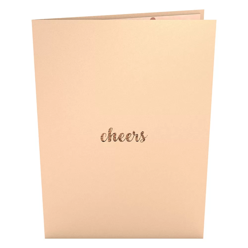 The peachy front cover features a metallic “cheers” message, written in an elegant gold cursive font. Upon opening this design, two light blue champagne flutes pop up, filled to the brim with delicious bubbles. Metallic pink bubbles cascade down the side of these glasses and onto the background of the pink watercolored background of this design. Cheers!