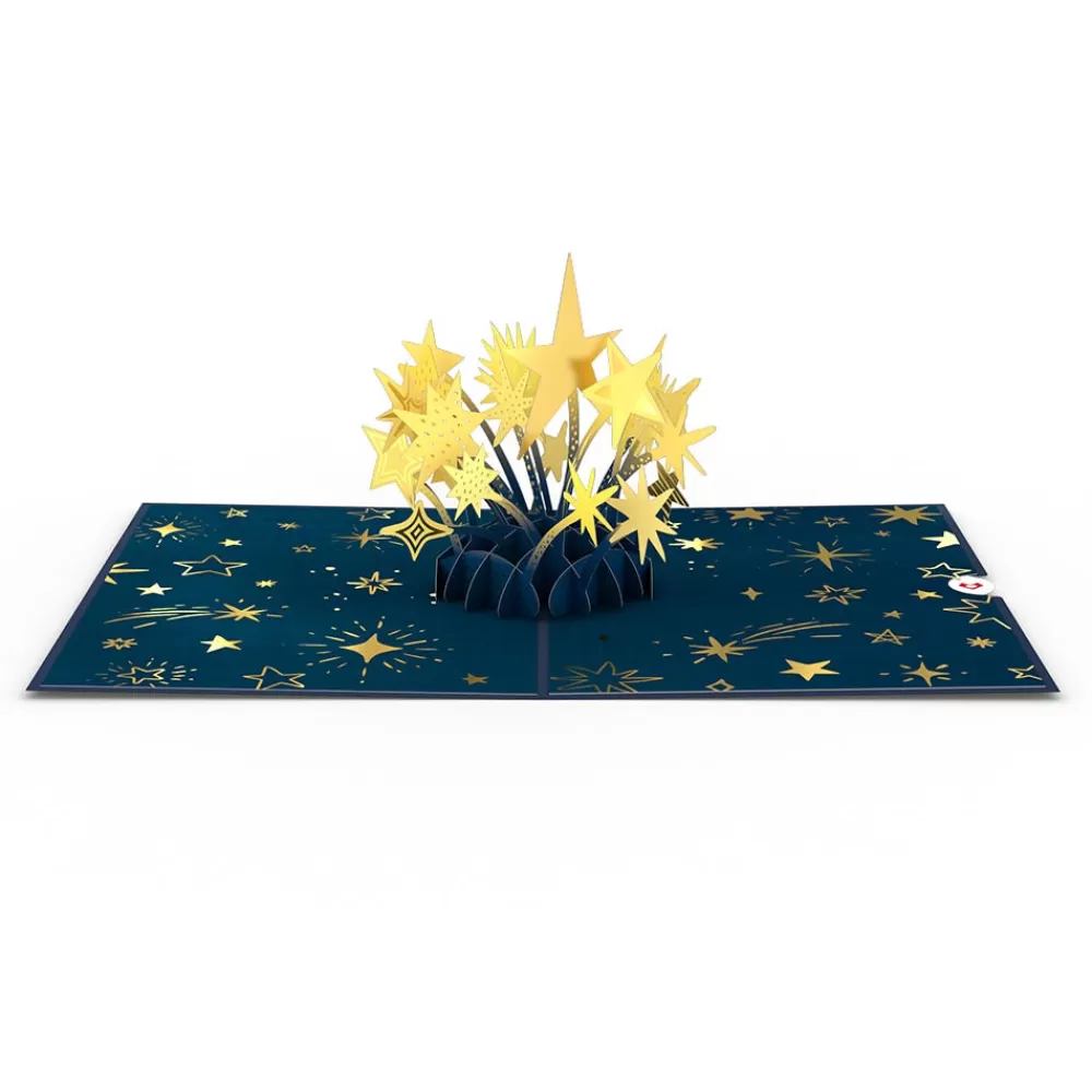 The cover of this sparkling card is dark blue and speckled with shimmery and twinkling gold and yellow stars. The message “You’re a star” is written on the front in an elegant font. Once opened, a vibrant 3D explosion of more gold and yellow stars pops out against a dark colored background, patterned with more glimmering falling stars, shooting stars, and various sparkling celestial suns. This card shows joy, celebration, beauty, and the wonder of the cosmos all in one firework burst of intricate paper.