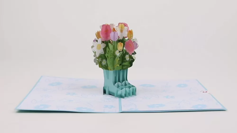 This card features a powder blue cover with the message ‘Happy Mother’s Day.’ Around the message, delicate little bouquets of pink and white flowers with green leaves offer a hint of what awaits inside. When you open the 3D card, you’re greeted with the charming pop-up image of a bouquet of flowers bursting from a pair of blue gardening boots. The bouquet includes flowers like roses, daffodils, tulips, and daisies in pink, yellow, purple, and white. The boots sit upon a white page with an endearing pale blue flower pattern.