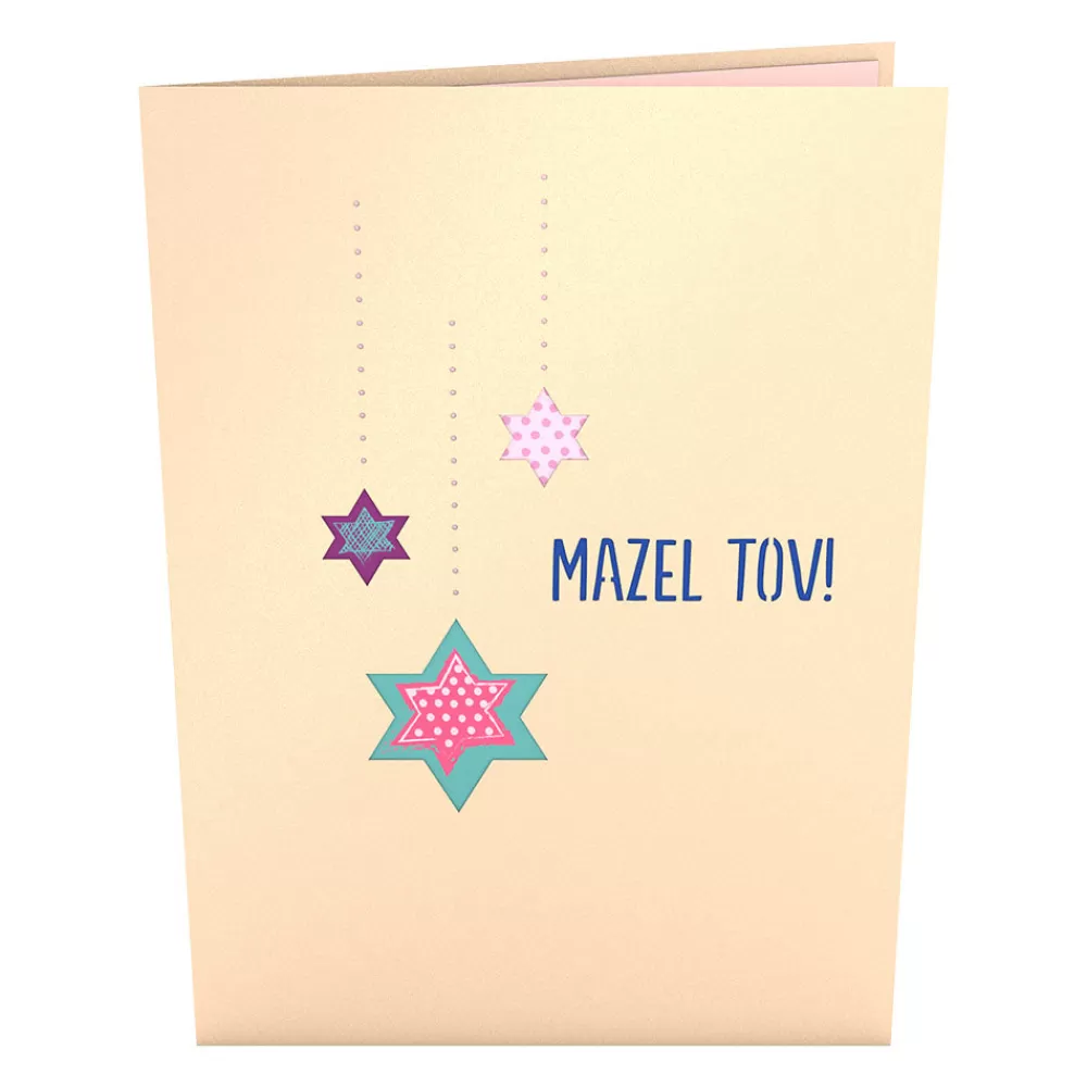“Mazel Tov!” is written across this front of this champagne-colored card alongside three decorative Stars of David. A bright pink 3D Star of David pops up from the middle of this design upon opening. The pale pink background of this pop-up card is adorned with pink, purple, blue, and teal star doodles.