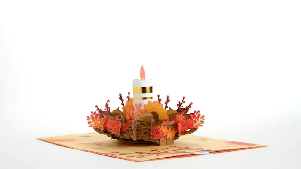 The exterior of this homely 3D card features a bright yellow sunflower, warm autumn leaves, and cheerful holly berries set against a rich orange background. When you flip the card open, a woven basket bursting with fall foliage blooms to life in pop-up form. Rising from the basket’s center is a single, lustrous white candle with gold trim and a deep orange flame. The picnic table pattern on the card beneath the basket, complete with scattered leaves and acorns, completes the image of a fall festival in full swing.