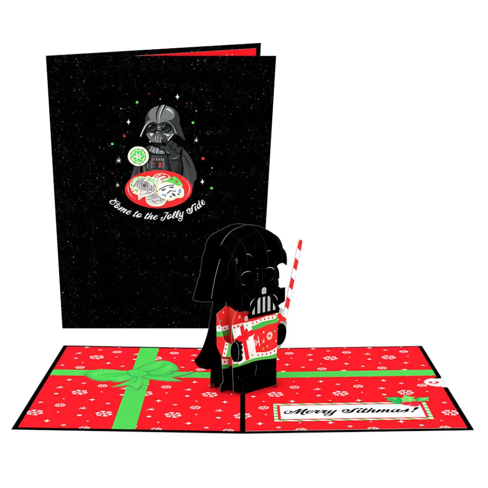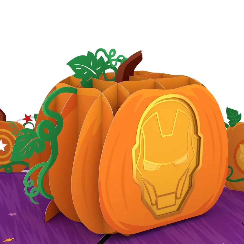 “No tricks all treats” is written on the cover of this Halloween pop-up card. Upon opening, Grogu™️ sits holding a pumpkin full of sweet candy treats in his lap, wearing the pumpkin stem atop his head like a hat. The Mandalorian’s helmet is carved into the pumpkin, and is also featured in a pattern on the inner panels of this design.