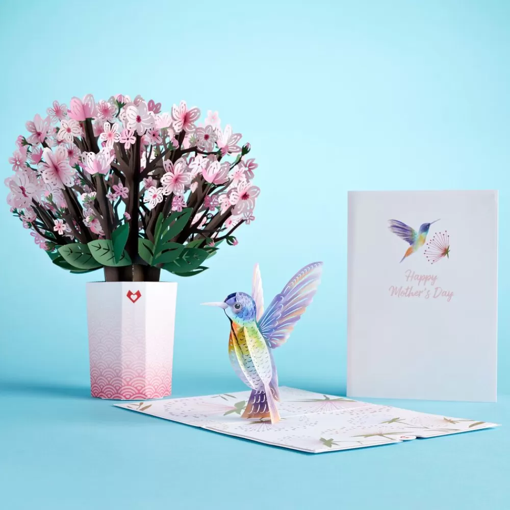 This bundle includes a paper flower bouquet and a pop-up card that features a rainbow-colored hummingbird and a dandelion on the front cover. When you open the card, the multicolored hummingbird springs to life, popping up from the page and standing on a spray of dandelions. The bouquet presents a heap of cherry blossoms held up by strong brown stems with green leaves, their bright pink blooms creating a canopy of flowers over the gradient vase.