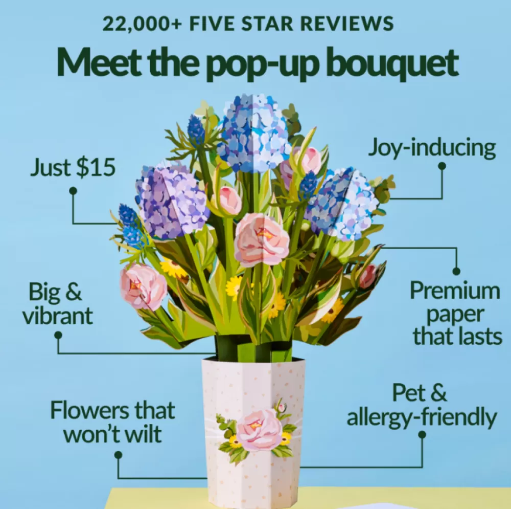 Lovepop Pop-Up Bouquets — our large, standalone centerpieces that are perfect for giving and display. These paper flower bouquets have the same premium quality as Lovepop greeting cards, and are the perfect gifts for small moments, big milestones, or just because. With over 22,000+ 5-star reviews, these allergy-free pop-up bouquets are sure to surprise & delight your loved ones. Plus, they’ll never wilt.