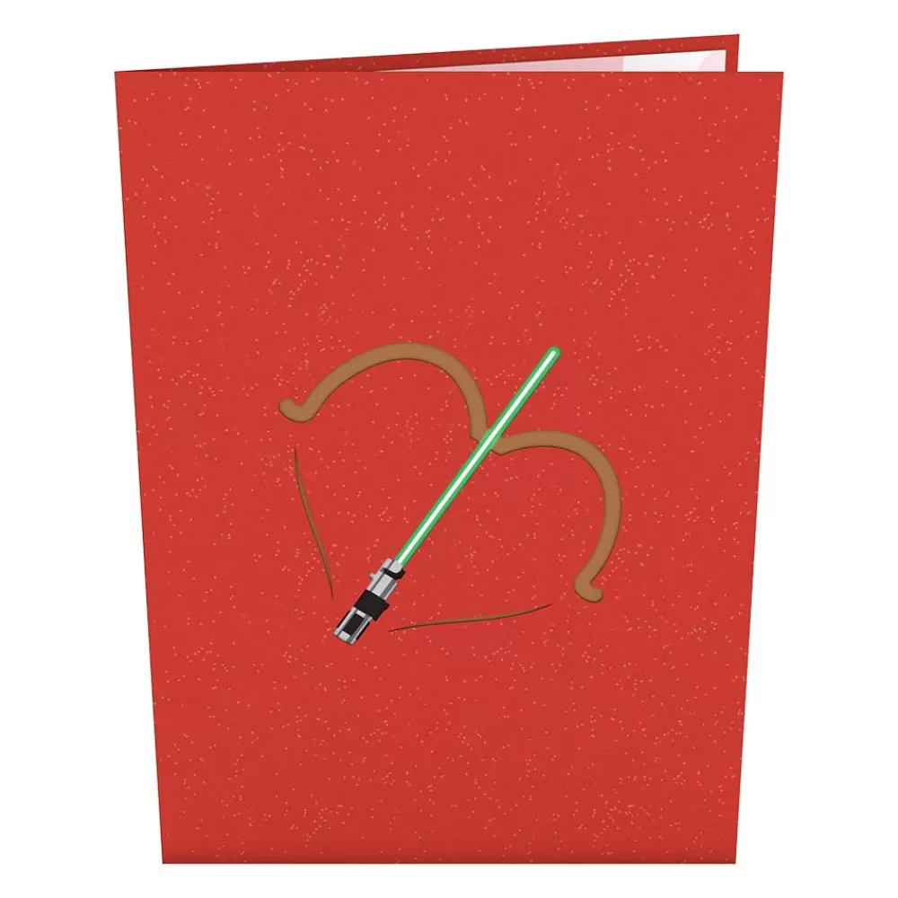 A glowing green lightsaber™ is strung in a classic cupid’s bow on the front of this ruby red card. Inside, a pop-up Yoda™ floats above a red and pink heart-spotted cloud. With laser-cut wings and the lightsaber-drawn bow, Yoda appears prepared to spread a message of love from above. The dreamy cotton candy pink illustrated background features the metropolis of Cloud City, a memorable galactic location for any fan of the film franchise.