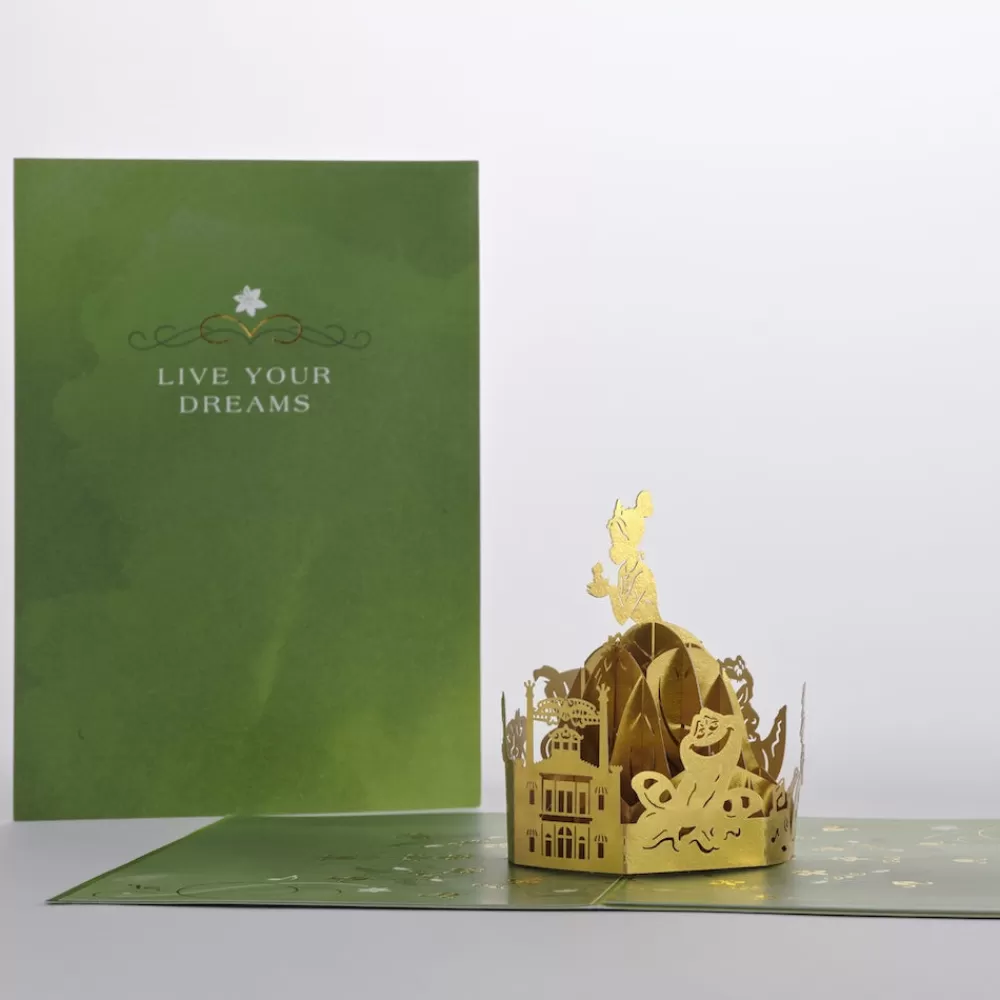 Our Disney’s Ultimate Princess Celebration features five beautifully handcrafted pop-up cards. Each design depicts a different message on the front cover and a different princess upon opening. The Disney Princess characters are constructed out of stunning metallic paper, adding a touch of elegance to each design.